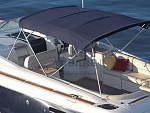 Тент биминитоп представляет собой козырек специфического кроя, сшитый из прочной ткани и натягивающийся над кокпитом для защиты от прямых солнечных лучей и дождя. Этот тент работает как тканевая крыша или зонт, предохраняя пассажиров от погодных условий.